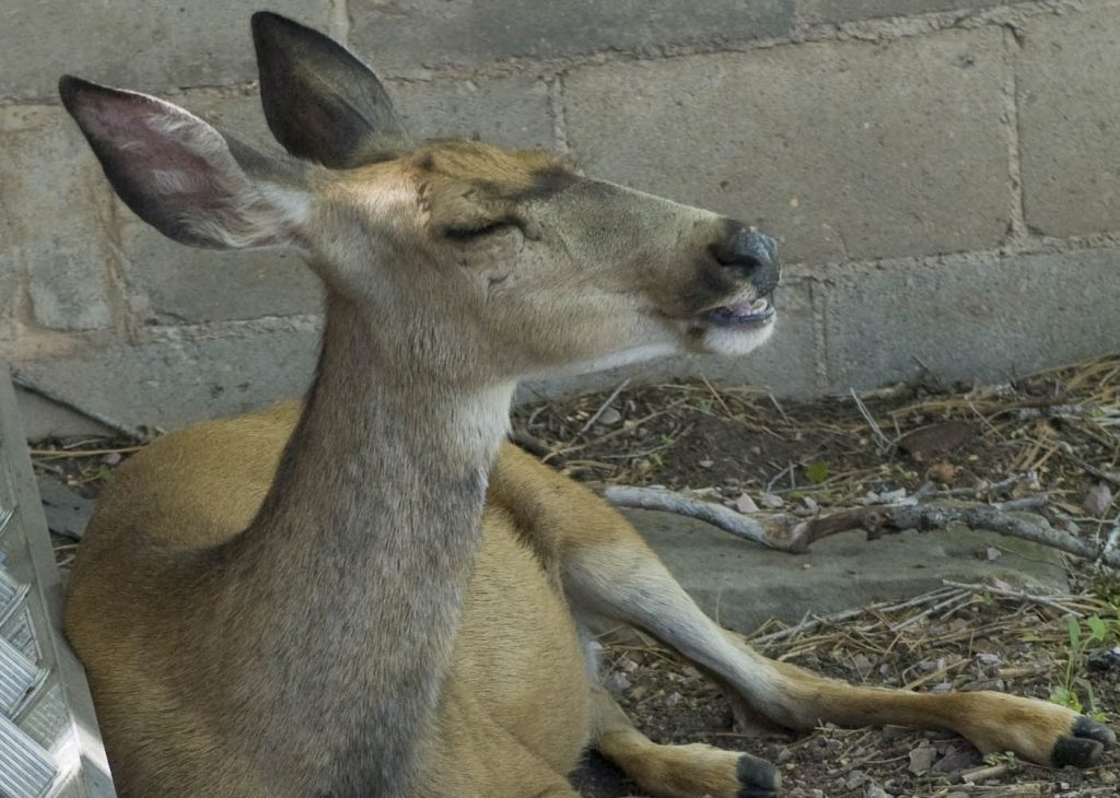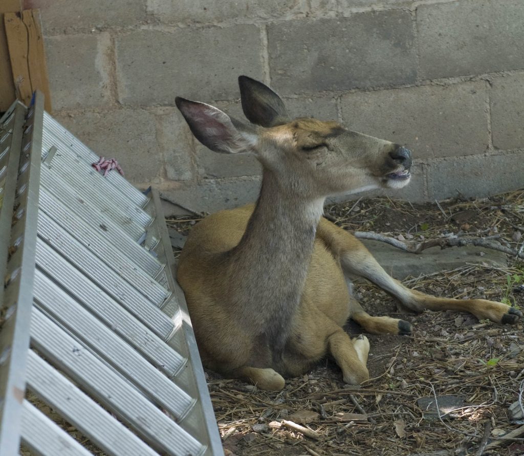 She beds down in soft, green grasses behind my cabin.